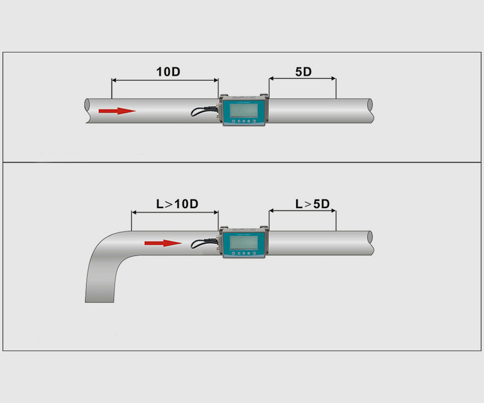 為保證流量計的測量精度,流量計附近安裝的直管段長度盡量滿足以下要求:上游>20D,下游>10D。
